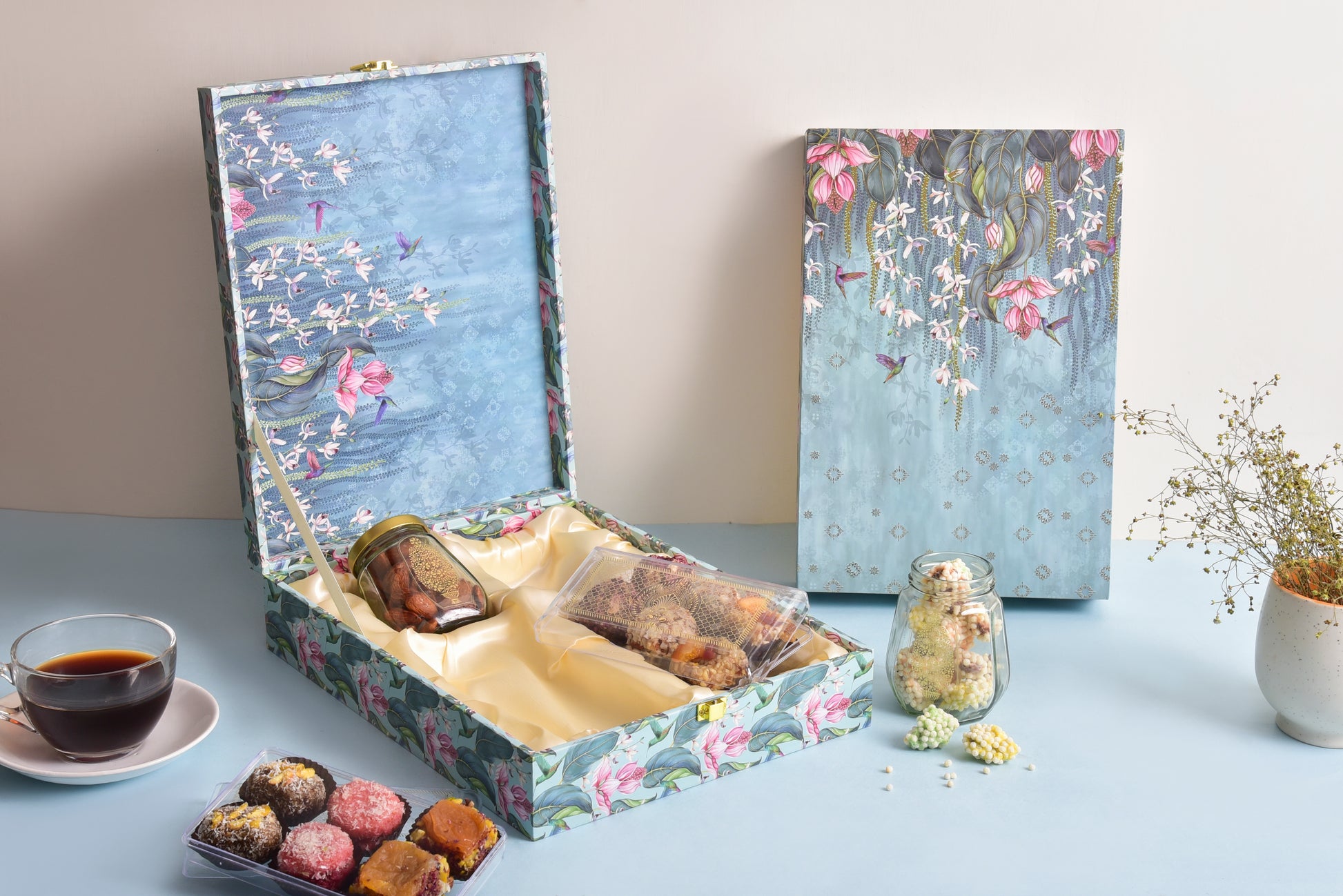 Delicate, delightful, and distinctly charming — this 2 Jar plus 2 Acrylic Box in Gardenia Print brings floral elegance to modern-day gifting. Designed with soft gardenia patterns and a touch of sophistication, this set is perfect for festive favors, housewarmings, or simply adding a hint of floral grace to your kitchen or gift collection. The set includes 2 classic jars and 2 clear acrylic boxes, ideal for storing nuts, sweets, spices, or little treasures. With its blend of beauty and function, this thoughtfully crafted box makes every gift feel special and every space bloom with elegance.