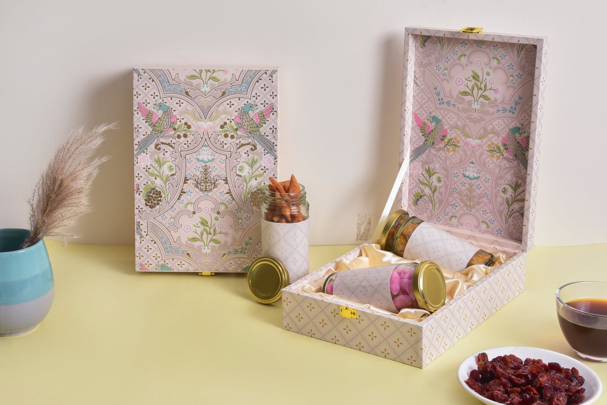 Bring a splash of charm to your gifting with our 3 Jar Box in Cream Parrot Design – a perfect blend of subtle elegance and vibrant flair. Featuring a soothing cream base adorned with playful parrot art, this box houses three jars ready to be filled with your favourite festive delights. Ideal for weddings, festivals, or thoughtful return gifts, it’s a reusable beauty that adds grace and character to every celebration. Gifting made graceful, the parrot way!