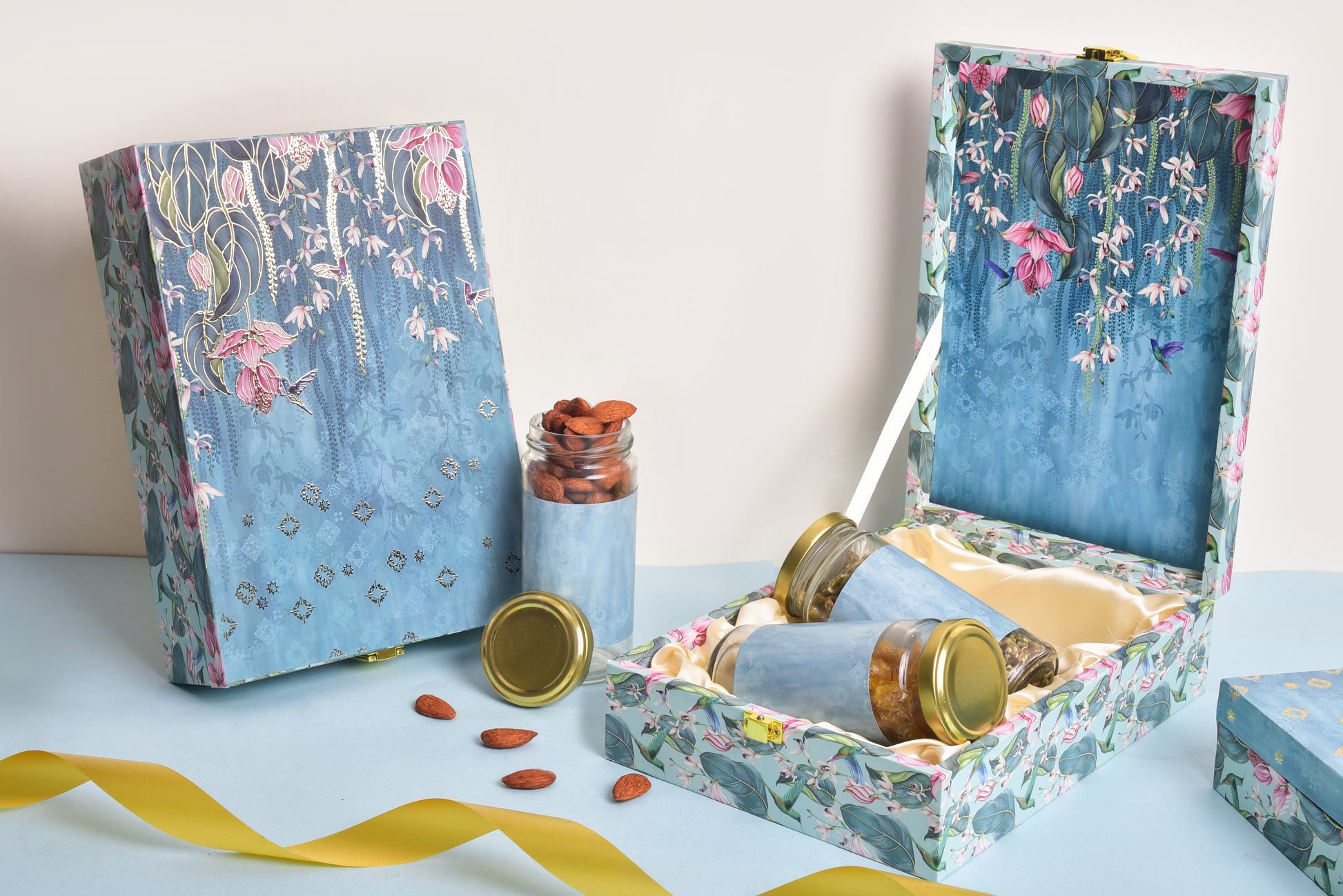 Delicate, elegant, and thoughtfully designed, our 3 Jar Box in Gardenia Print brings a refreshing floral charm to your gifting. Featuring a soft, nature-inspired print, this box houses three jars perfect for dry fruits, sweets, or gourmet treats. Ideal for festive occasions, return gifts, or special celebrations, its compact yet stylish design adds a touch of sophistication to every gesture. Reusable and refined, it’s the perfect blend of beauty and practicality.