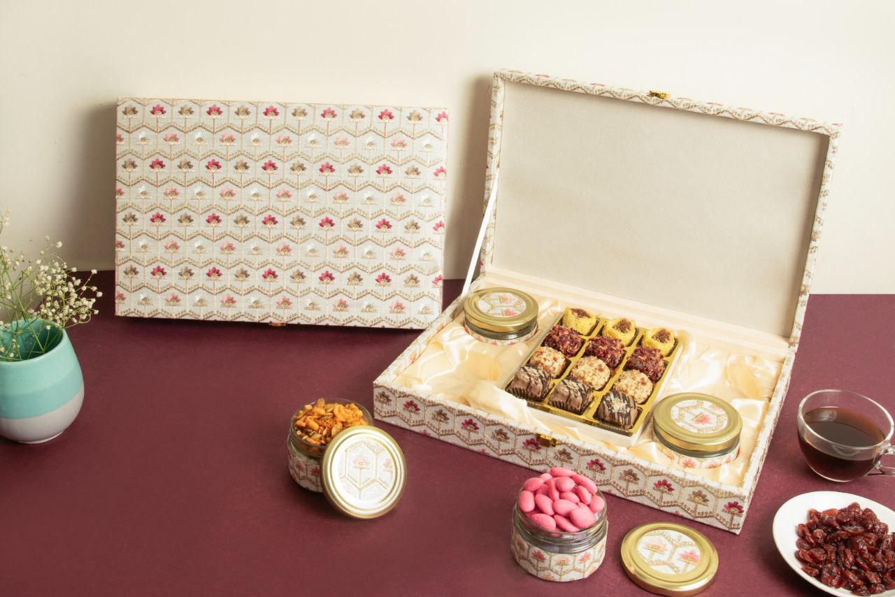 In The Pack: One hamper box with four jars for sweets and twelve partitions for snacks & nuts.