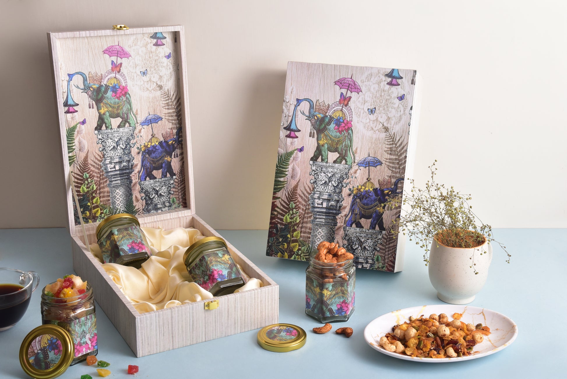 Make your gifting stand out with our 4 Jar Box in majestic Tusker Print. A bold blend of tradition and style. Featuring four uniquely shaped jars nestled in a beautifully designed box, this piece celebrates the grandeur of the royal elephant, a timeless symbol of strength and prosperity. Perfect for festive treats, dry fruits, or gourmet delights, its striking hexagonal layout and reusable charm make it an unforgettable gifting choice. Elegant, eye-catching, and rich in cultural flair, this box adds a royal touch to every occasion.