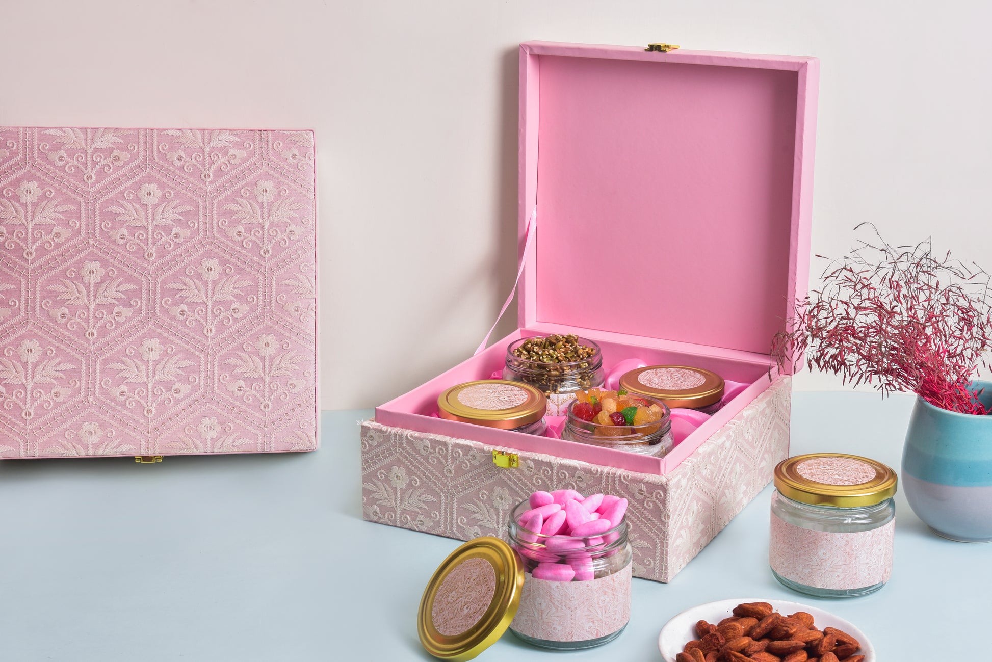 Delicate, dreamy, and designed to impress — Our Pink 4 Jar Embroidery Box is a true celebration of elegance. Wrapped in soft pink tones and adorned with intricate embroidery, this box brings a touch of sophistication to your gifting moments. Perfect for filling with jars of treats or treasures, it’s an ideal choice for weddings, baby showers, or festive gifting. Reusable, refined, and radiant. It's more than a box, it's a beautiful memory which is long lasting.