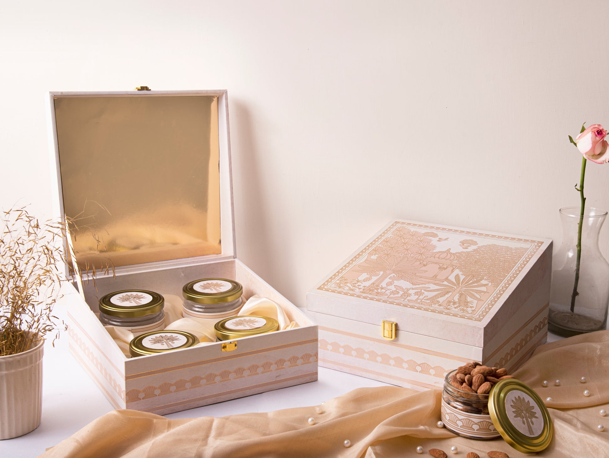 Gracefully designed in a soothing Vanshala Beige design, this 4 Jar Tapered Box brings together understated luxury and practical charm. With its sleek tapering silhouette and premium finish, it makes for a refined gifting option for festive moments or heartfelt occasions. The four spacious jars inside can be filled with dry fruits, snacks, or sweet treats — adding a personal touch to every celebration. Whether for a wedding, Diwali, or a corporate gesture, this box is where elegance meets utility in the most tasteful way.