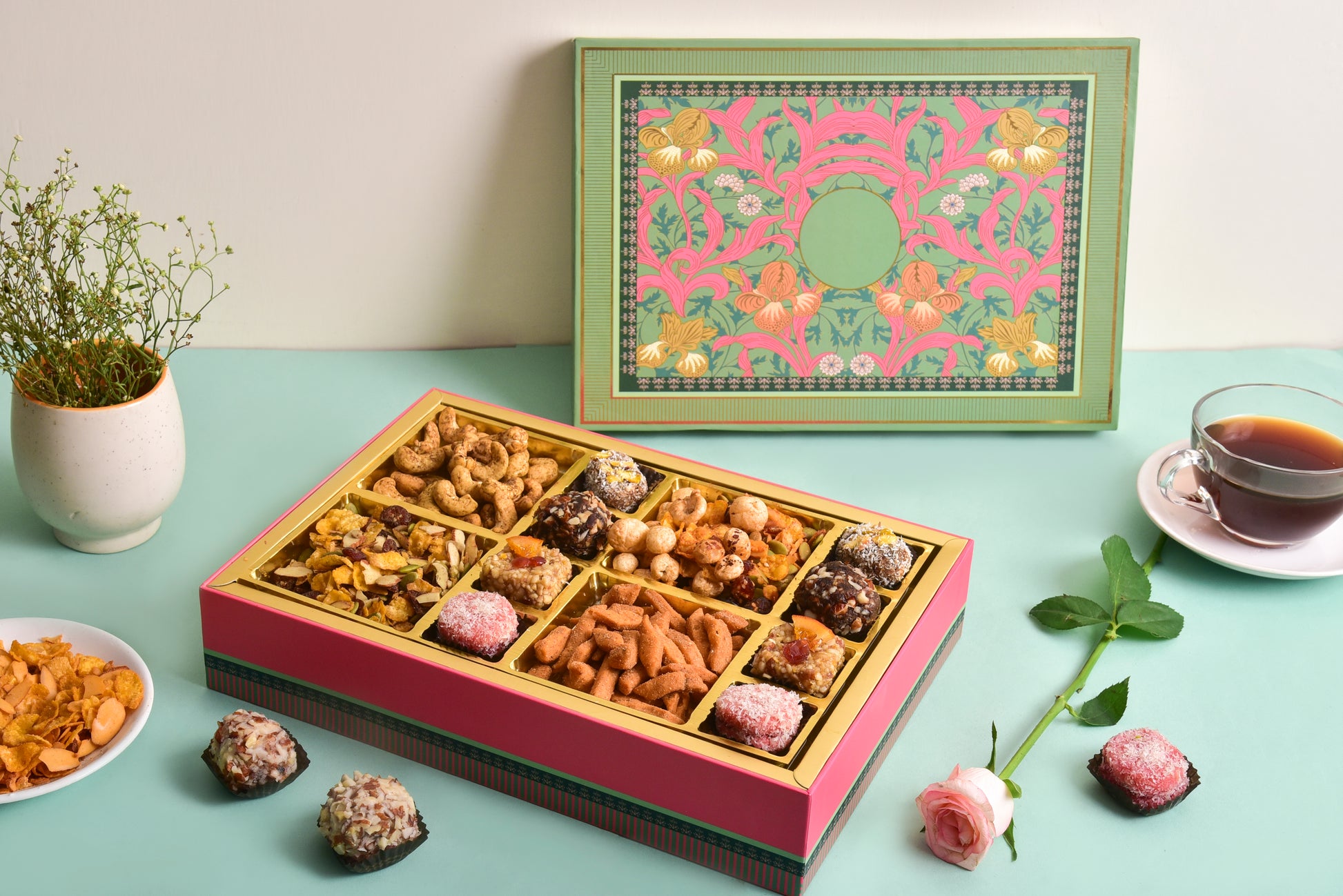 In The Pack: One hamper box with four big partition for sweets and eight cavity partitions for snacks & nuts .