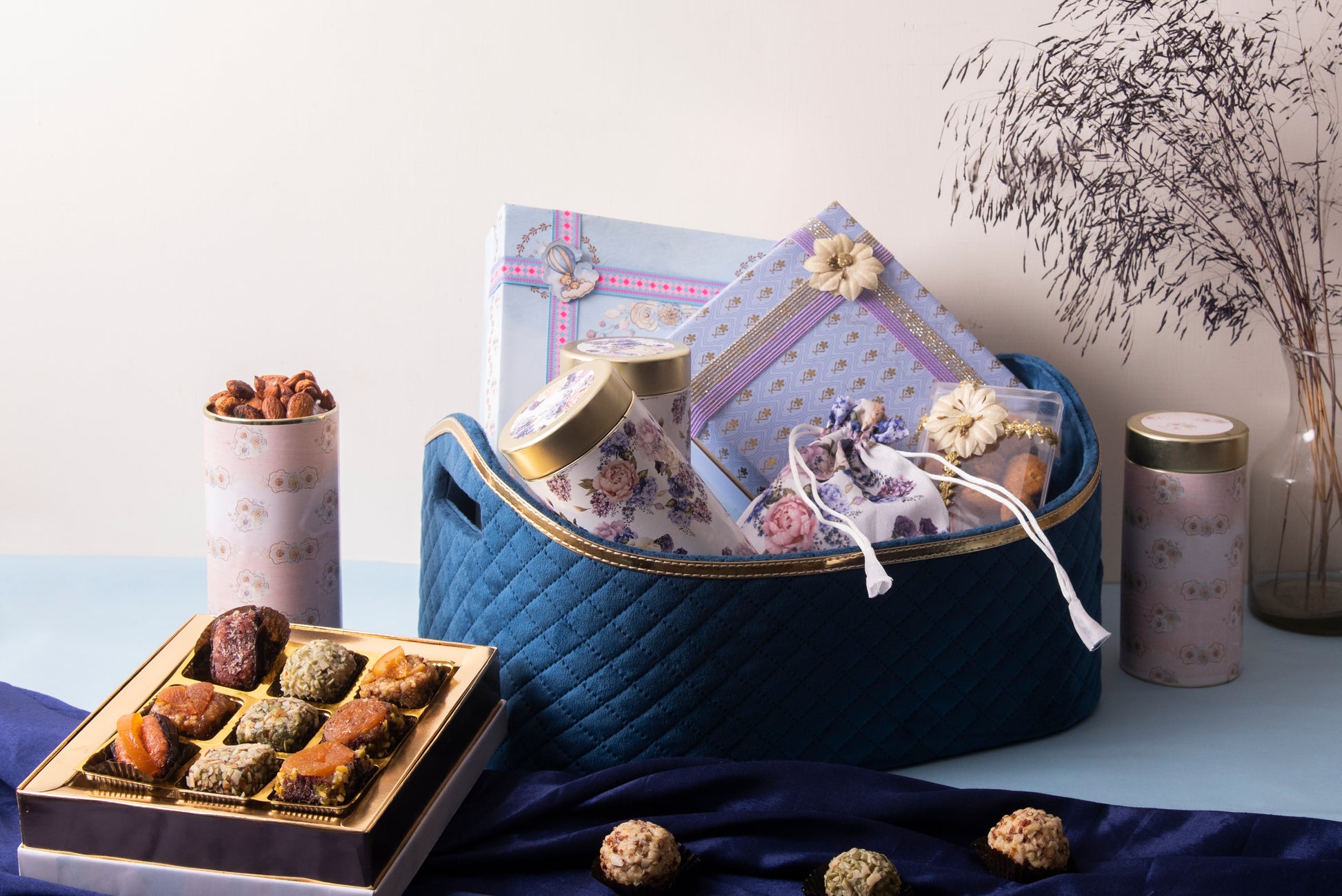 Timeless elegance in every thread — our Blue Velvet Basket Set of 7 Items is more than just a gift, it's an experience. Designed in rich royal blue velvet with exquisite craftsmanship, this basket features seven thoughtfully arranged compartments contains Potli, Small box and many more to hold dry fruits, sweets, or handpicked festive delights. Elegant, versatile, and fully reusable, it transforms into a stunning storage piece long after the celebration ends. Whether for weddings, festive occasions, or premium gifting — this basket is where luxury meets lasting utility.