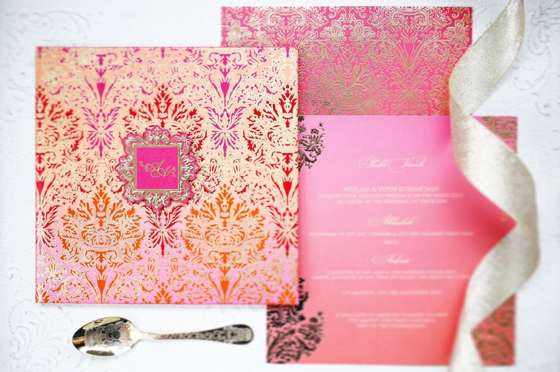 Designer Pink Orchid is a card that has gold foil embossed geometric designs to give it some elegance. It features embossed geometric designs all over at front.