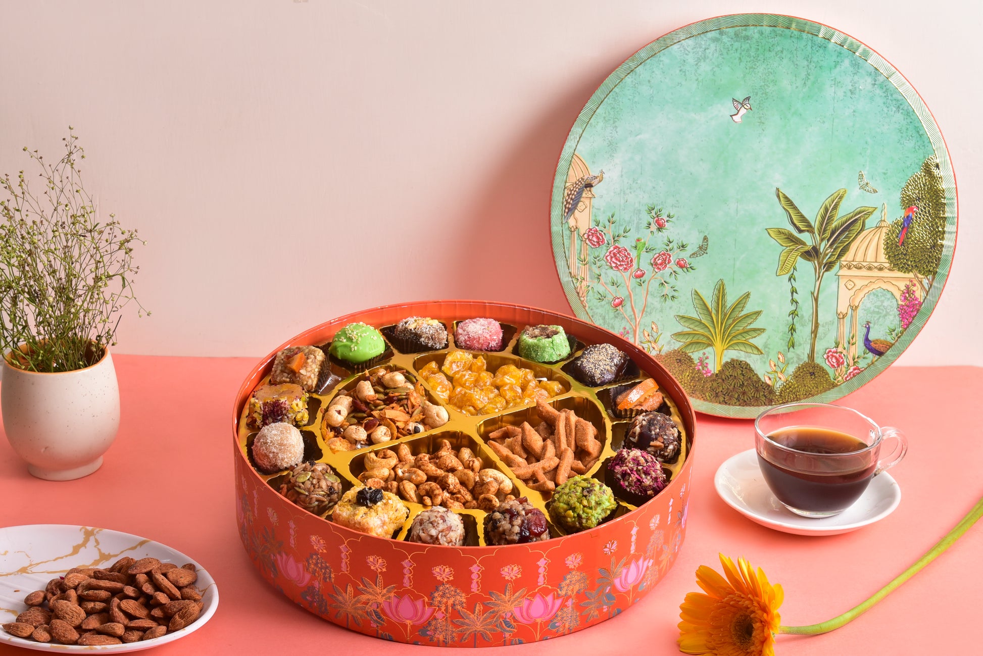 In The Pack: One hamper box with four big partition for sweets and eighteen cavity partitions for snacks & nuts.
